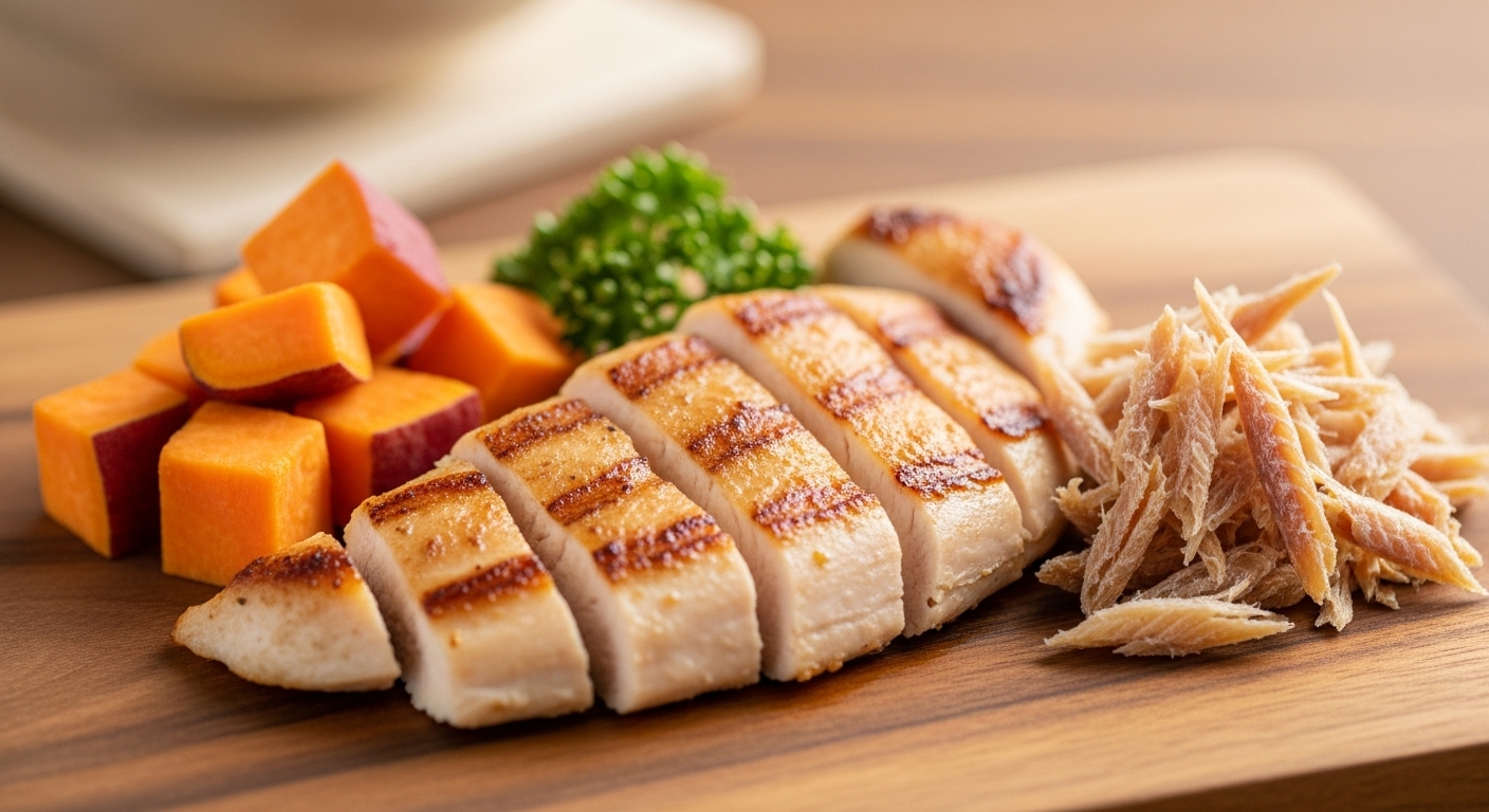 - 닭가슴살 (삶거나 쪄서): 양질의 단백질은 떨어진 체력과 면역력 보충에 필수입니다. 기름기 없이 삶아 잘게 찢어서 급여하세요.