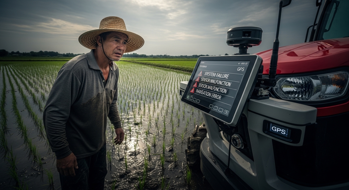 (Image Prompt: A puzzled farmer in a rice field looking at an autonomous tractor's screen with error messages. Professional photo, serious, detailed, cinematic lighting, 8k, photorealistic.)