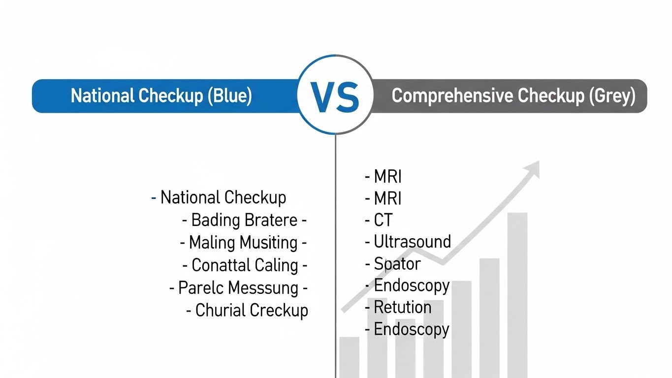 | **검사 범위** | 기본 신체 측정, 혈액/소변 검사, 흉부 X-ray 등 최소 항목 | MRI, CT, 정밀 초음파, 유전자 검사 등 광범위 |