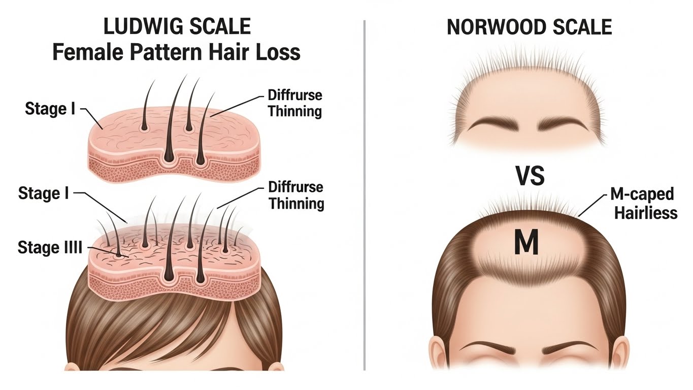 여성탈모는 주로 정수리 부분의 모발이 전반적으로 얇아지고 밀도가 낮아지는 '미만성(확산성) 탈모'가 특징입니다. 헤어라인은 비교적 잘 유지되는 경우가 많아요. 이걸 루드비히 분류법으로 진단하죠.