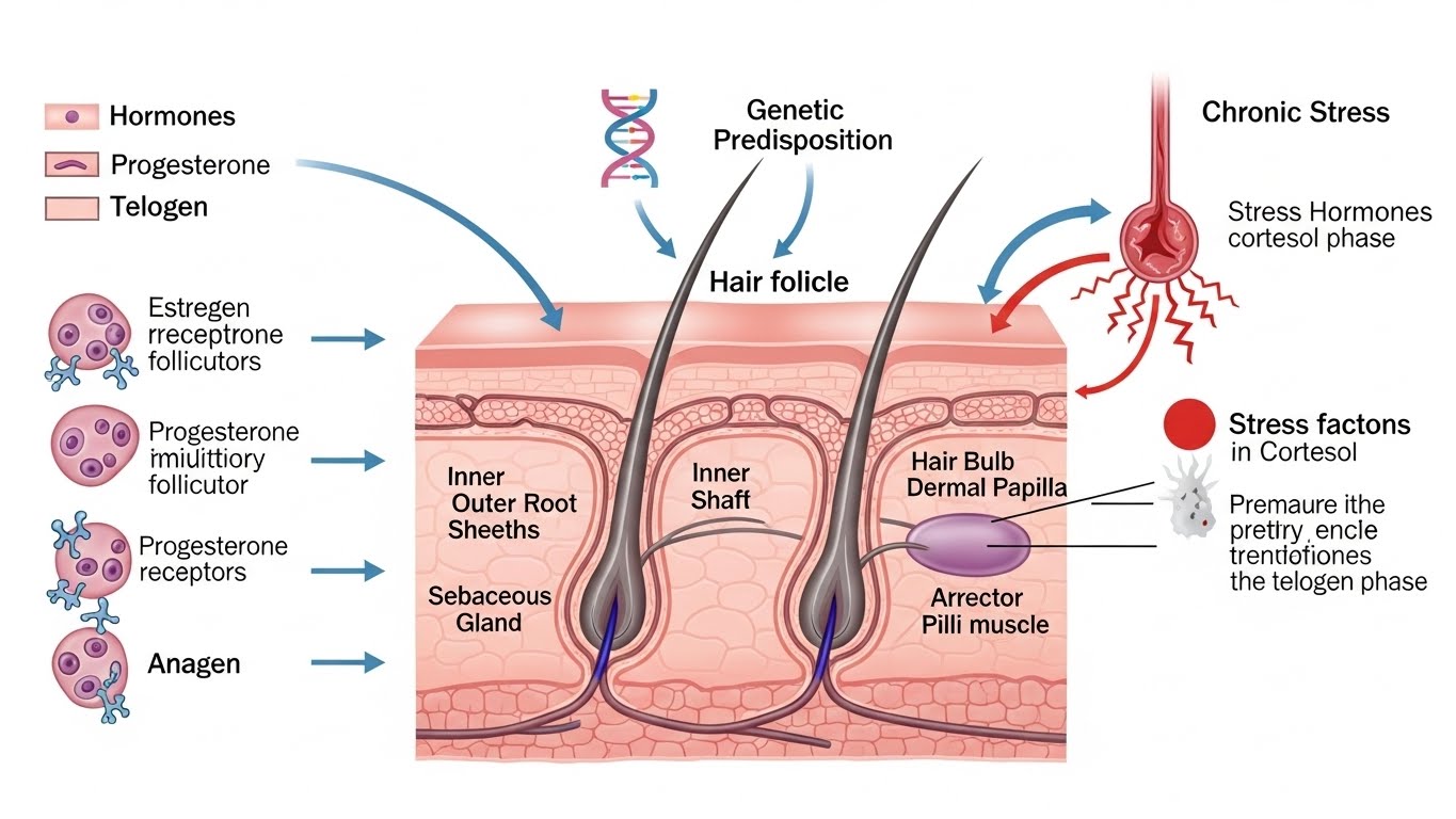 - ① 호르몬 불균형: 특히 출산 후, 폐경 전후, 갑상선 질환 등 호르몬 변화가 클 때 **여성탈모 증상**이 심해집니다. 에스트로겐이 감소하면 모발 성장이 둔화되거든요.