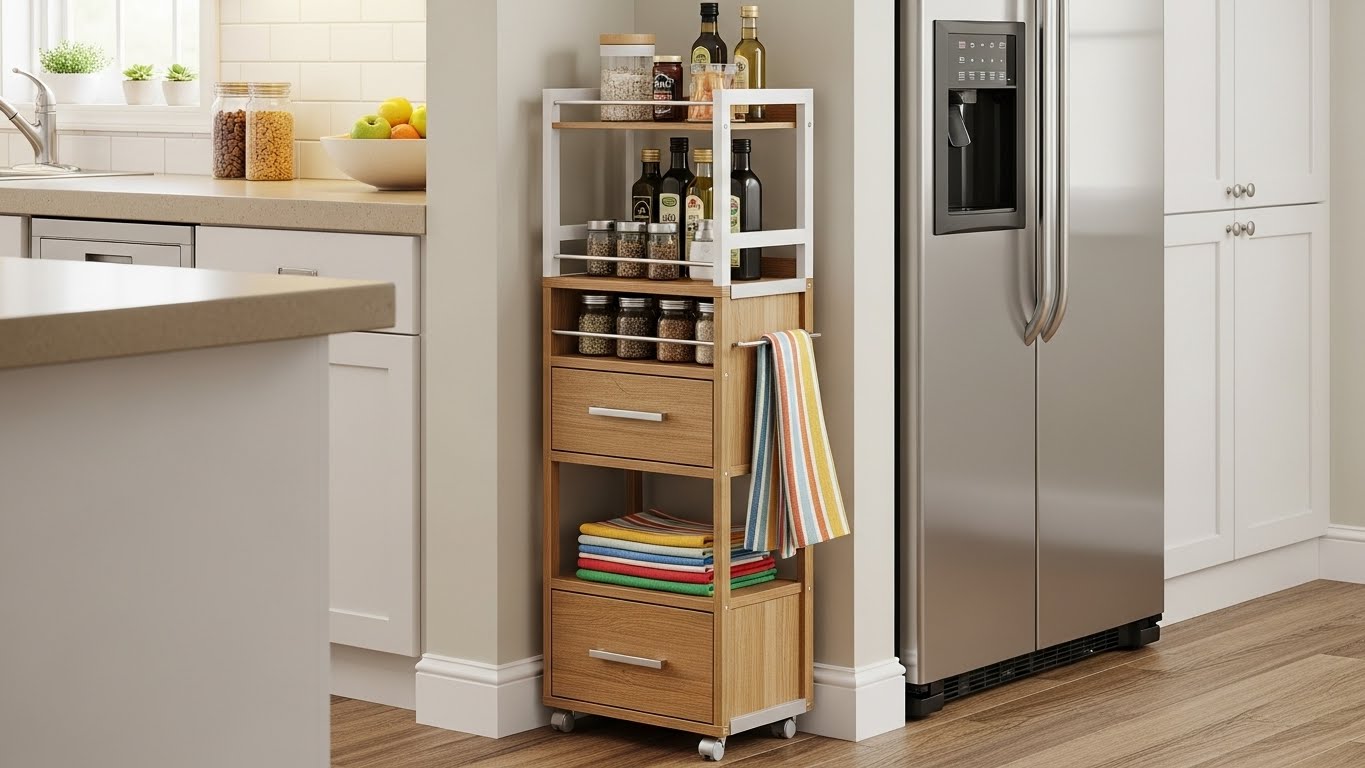 바로 **틈새 주방수납장**을 활용하는 건데요. 슬림하고 이동이 가능한 제품들이 많아 좁은 주방에서 정말 효자템 역할을 해줍니다. 저는 여기에 자주 쓰는 양념이나 식료품들을 보관해서 요리 동선을 짧게 만들었어요.
