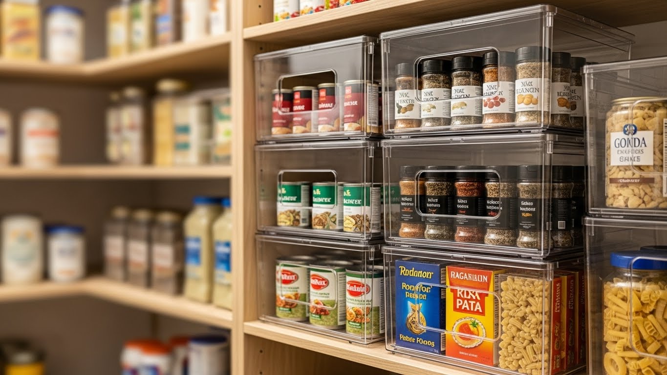 - **클리어 박스 스태킹:** 같은 종류의 투명 **펜트리 정리함**을 2~3단으로 쌓아 올리면, 남는 높이 공간을 완벽하게 채울 수 있습니다.