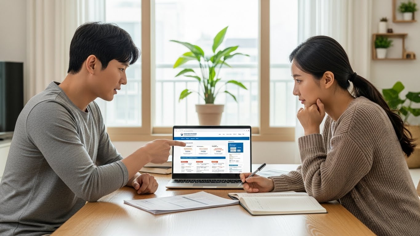 집에서 정부지원금 정보를 확인하는 30대 부부 모습