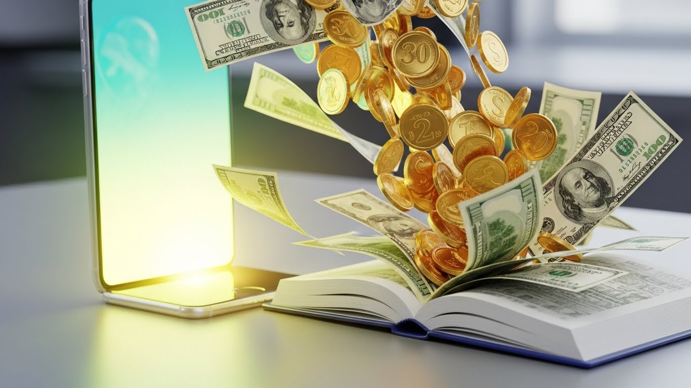 스마트폰 화면에서 동전과 지폐가 쏟아져 나와 통장으로 들어가는 3D 일러스트, 밝고 긍정적인 금융 이미지