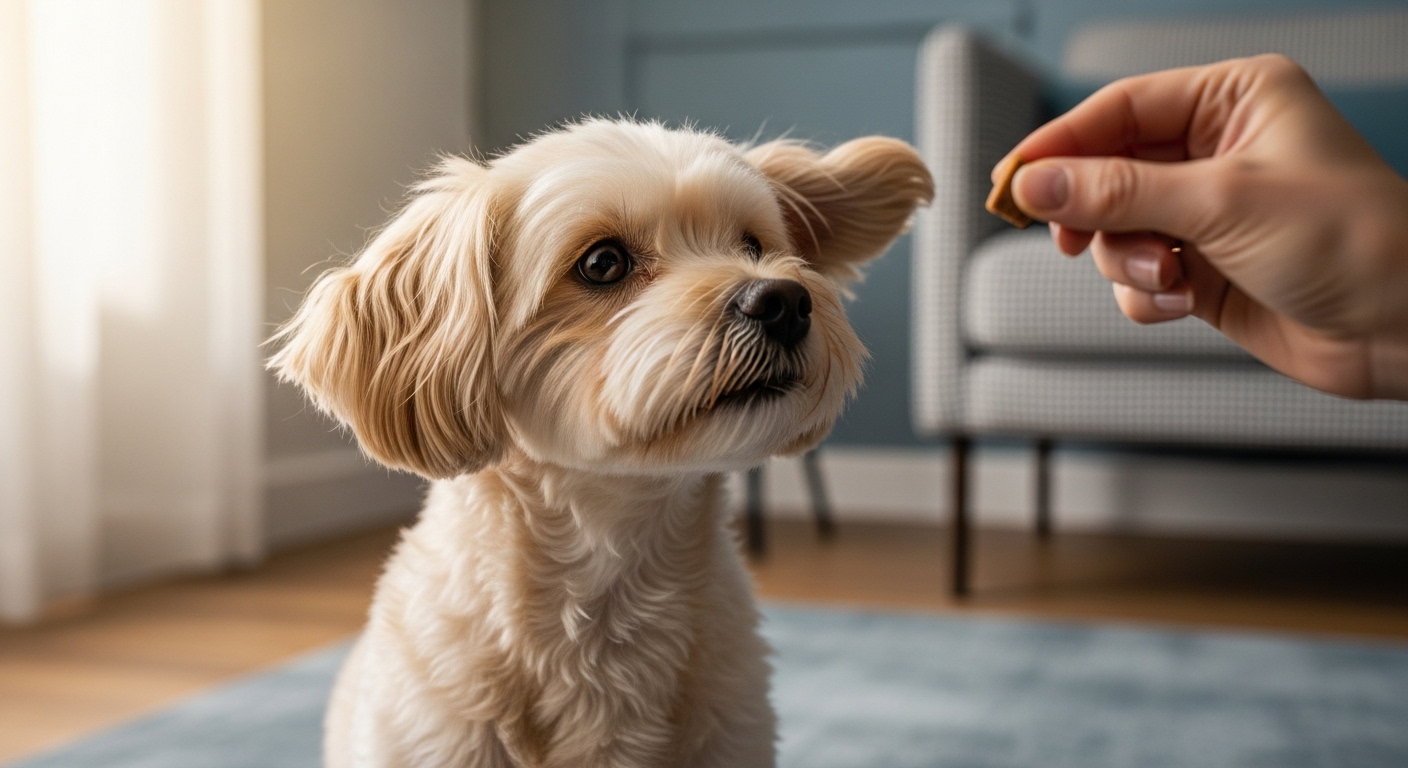 차분하게 앉아 보호자의 간식에 집중하는 소형견 강아지의 모습. 짖음 훈련 성공 후의 평화로운 순간을 연상시킨다.