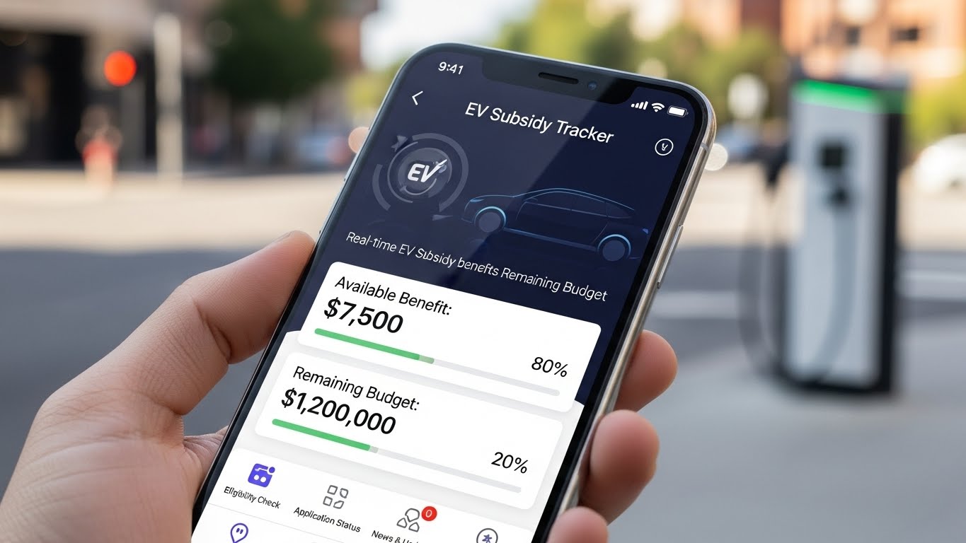 스마트폰으로 실시간 전기차 보조금 혜택과 잔여 예산을 조회하는 모습의 고퀄리티 이미지
