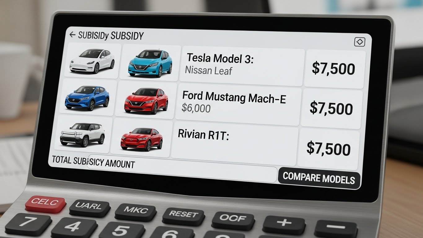 다양한 전기차 모델과 각각의 보조금 액수가 표시된 디지털 계산기 이미지