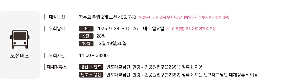 차 없는 잠수교 뚜벅뚜벅축제인 만큼, 주변은 차량 통제가 심하고 주차 공간도 부족해요. 이럴 땐 지혜롭게 대중교통이용이 필수 입니다, - 지하철 4호선 동작역이나 9호선 신반포역에서 걸어오는 게 가장 편해요.