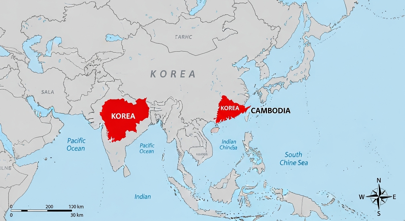 반면, 대한민국은 대륙과 해양 세력이 교차하는 **동북아시아**의 반도 국가입니다. 영토는 캄보디아보다 작지만, 세계 주요 해상 무역로에 인접해 있어 지정학적 중요성이 매우 높습니다. 이 위치적 차이(대륙 국가 vs. 반도 국가)는 두 나라의 역사와 경제 발전에 결정적인 영향을 미쳤습니다.