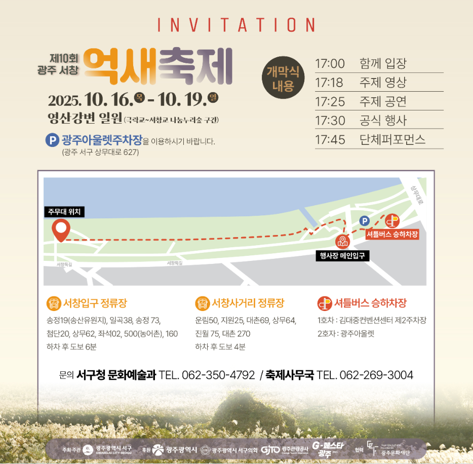 서창 억새축제는 광주 서구 서창동 일대, 영산강변에 위치한 대규모 억새밭에서 열리는 행사예요. '광주의 숨겨진 보물'이라고 불릴 만큼 아름다운 풍경을 자랑하는데요.